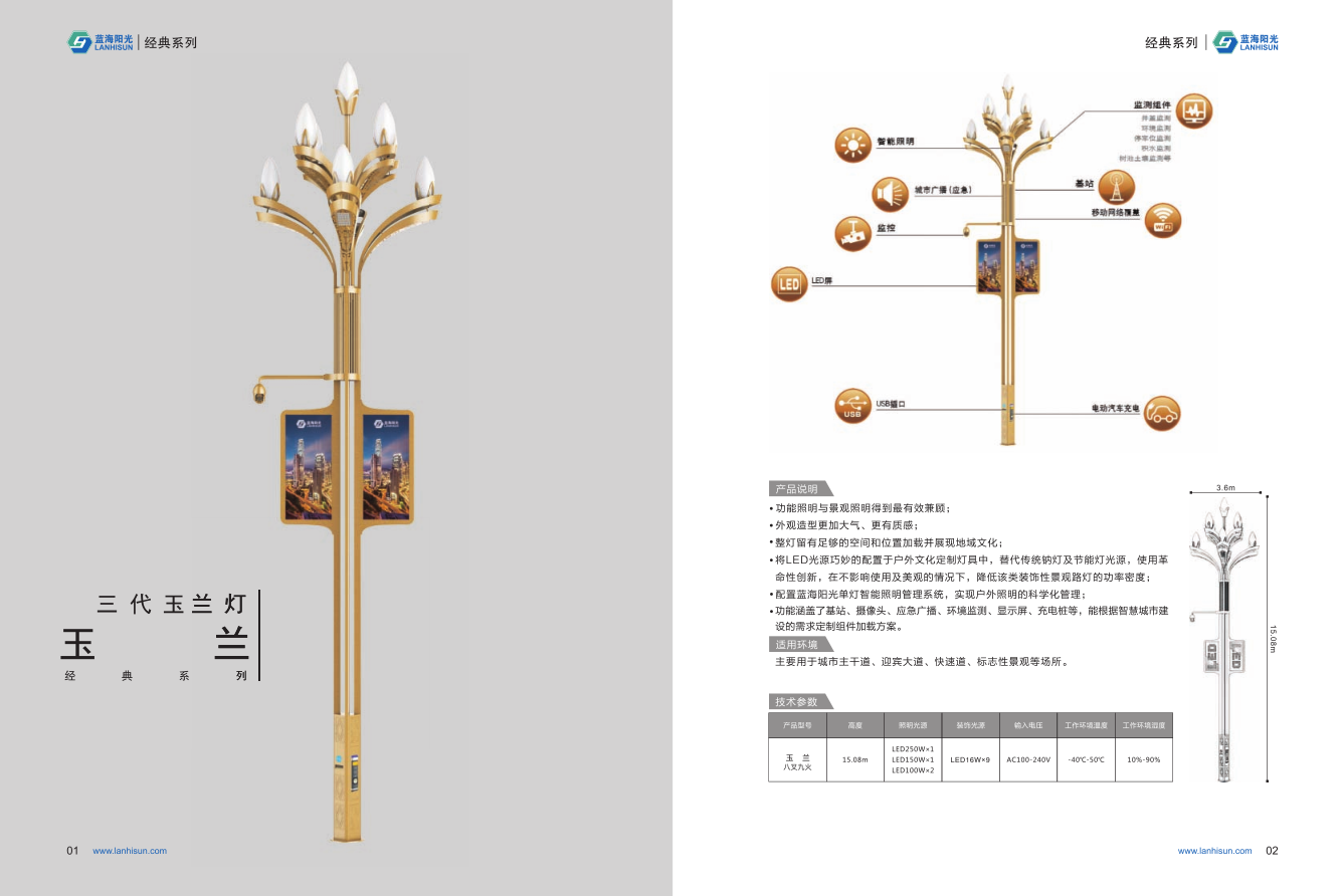 1、高度為6-16米; 2、花葉光源為4組LED光源,色溫2500-6500K,燈罩光源為9只LED裝飾光源,每個光源功率為30-60W; 3、LED驅動電源壽命可達五年; 4、整體熱鍍鋅噴塑,保證燈桿15年不生銹; 5、可以根據(jù)使用地區(qū)的地域文化、產(chǎn)業(yè)特點等進行文化定制;