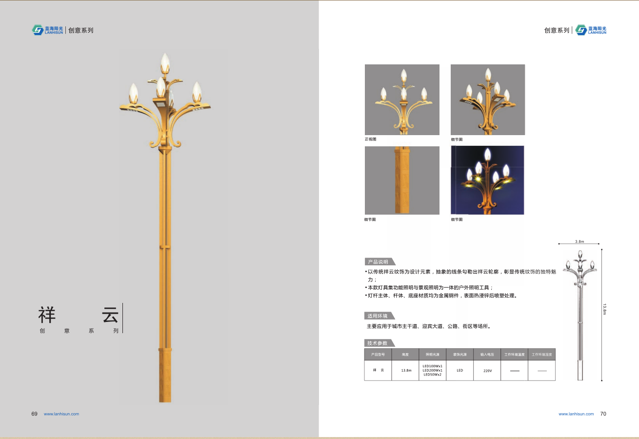 1、高度為6-16米; 2、花葉光源為4組LED光源,色溫2500-6500K,其余光源為LED裝飾光源,每個光源功率為30-60W; 3、LED驅動電源壽命可達五年; 4、整體熱鍍鋅噴塑,保證燈桿15年不生銹; 5、可以根據使用地區的地域文化、產業特點等進行文化定制;